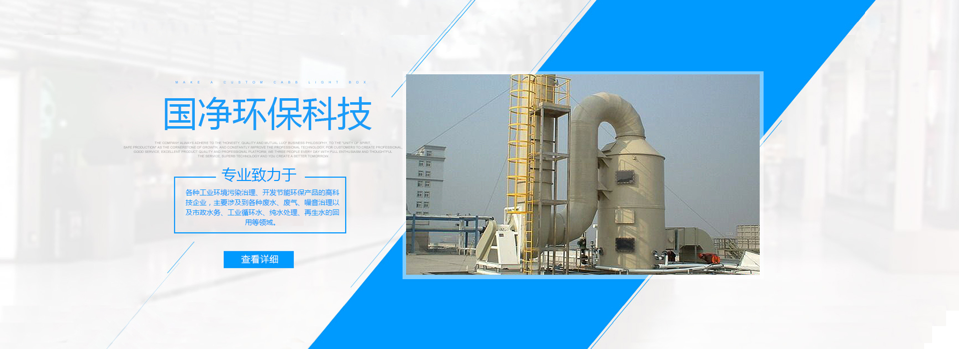 專業(yè)致力于各種工業(yè)環(huán)境污染治理、開發(fā)節(jié)能環(huán)保產(chǎn)品的高科技企業(yè),主要涉及到各種廢水、廢氣、噪音治理以及市政水務(wù)、工業(yè)循環(huán)水、純水處理、再生水回用、河流整治及生態(tài)修復(fù)等領(lǐng)域。